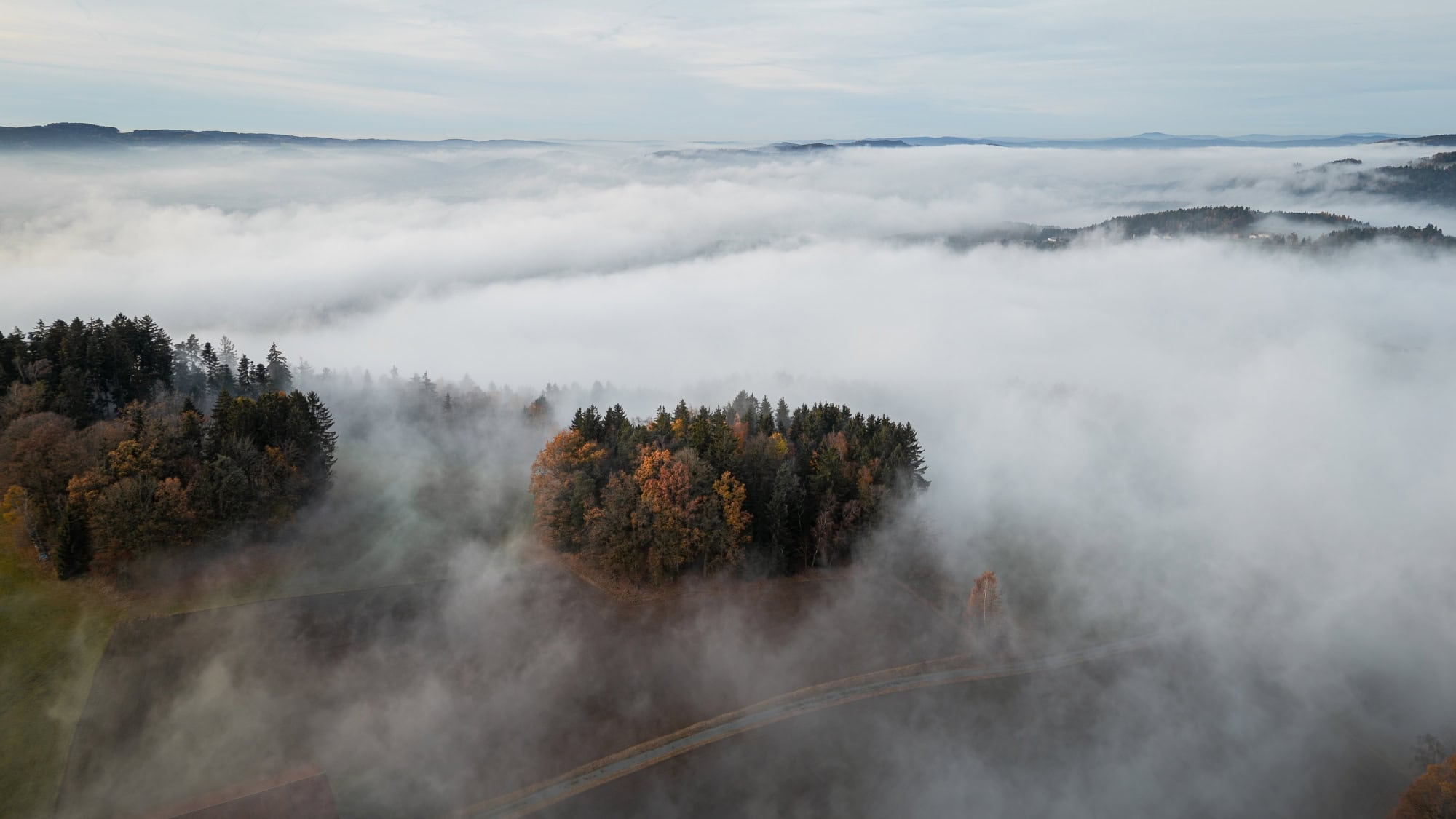 Drohennaufnahme eines Waldes, der von dichtem Nebel überdeckt ist. Nur an einzelnen Stellen geben die Schwaden den Blick auf die Bäume frai.