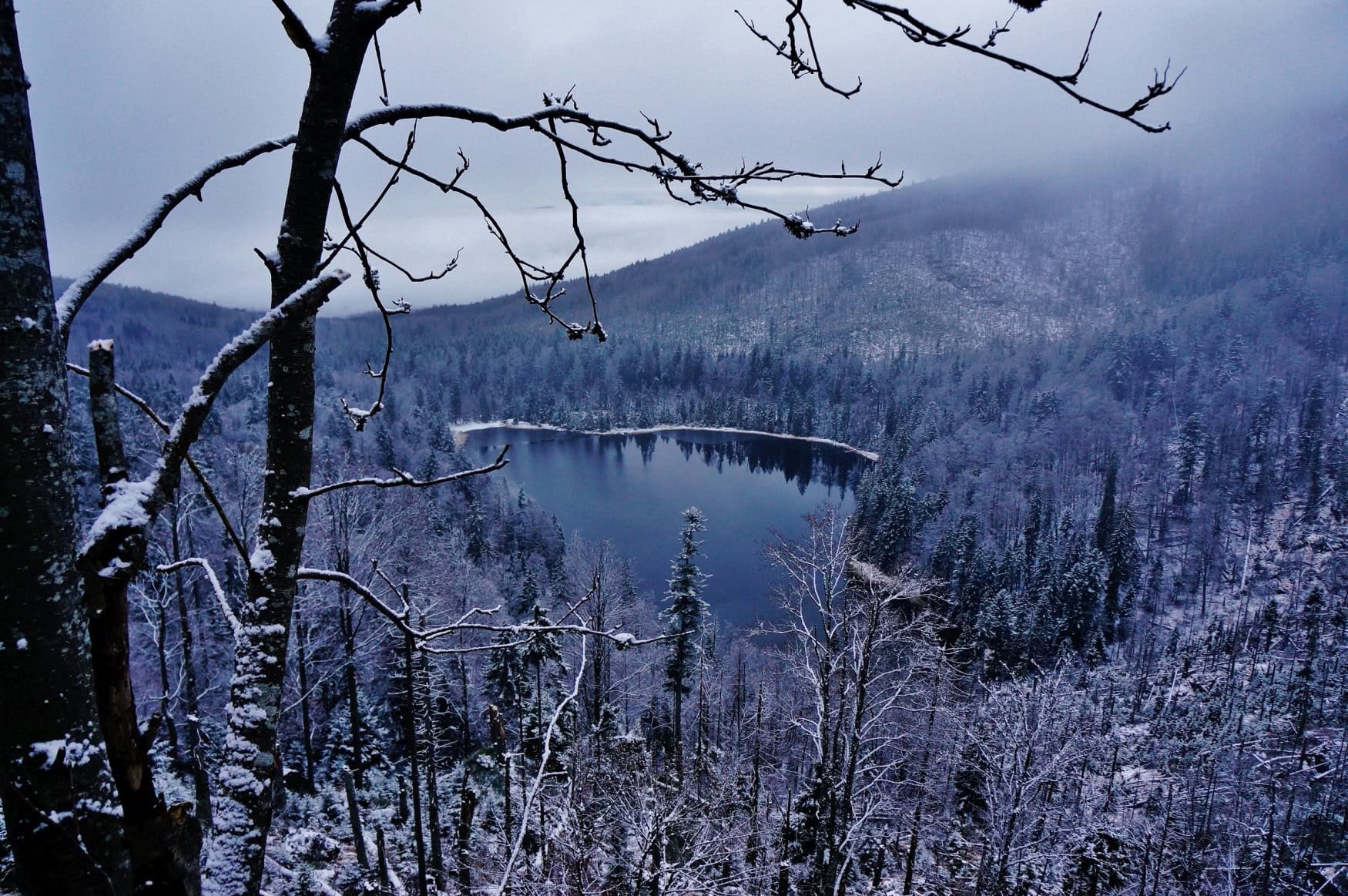Von einer bewaldeten Anhöhe geht der Blick auf einen von verschneiten Nadelbäumen gesäumten, stillliegenden See, in dessen Oberfläche sich die umliegende Winterumgebung spiegelt.