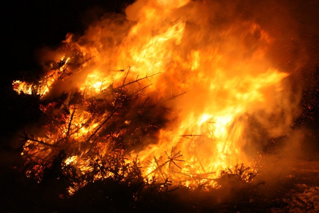 Ein großes Feuer brennt in der Dunkelheit. In den Flammen sind noch die Reste einiger Nadelbäume erkennbar.
