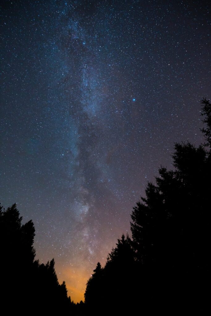 Night shot of a clear starry sky, portrait orientation; at the bottom edge, the silhouettes of two rows of trees run toward the bottom of the image, forming a “V.” From this, the Milky Way clearly emerges toward the top of the image.