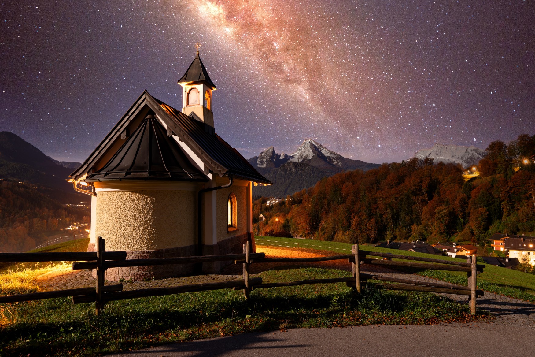 A long exposure of a Bavarian valley at night. On a hill to the left stands a small chapel, a road from left to right is illuminated by long drawn car lights, to the right are some houses. The peaks of the Alps are rising up in the background, the night sky with a clearly visible Milky Way crowns the image.
