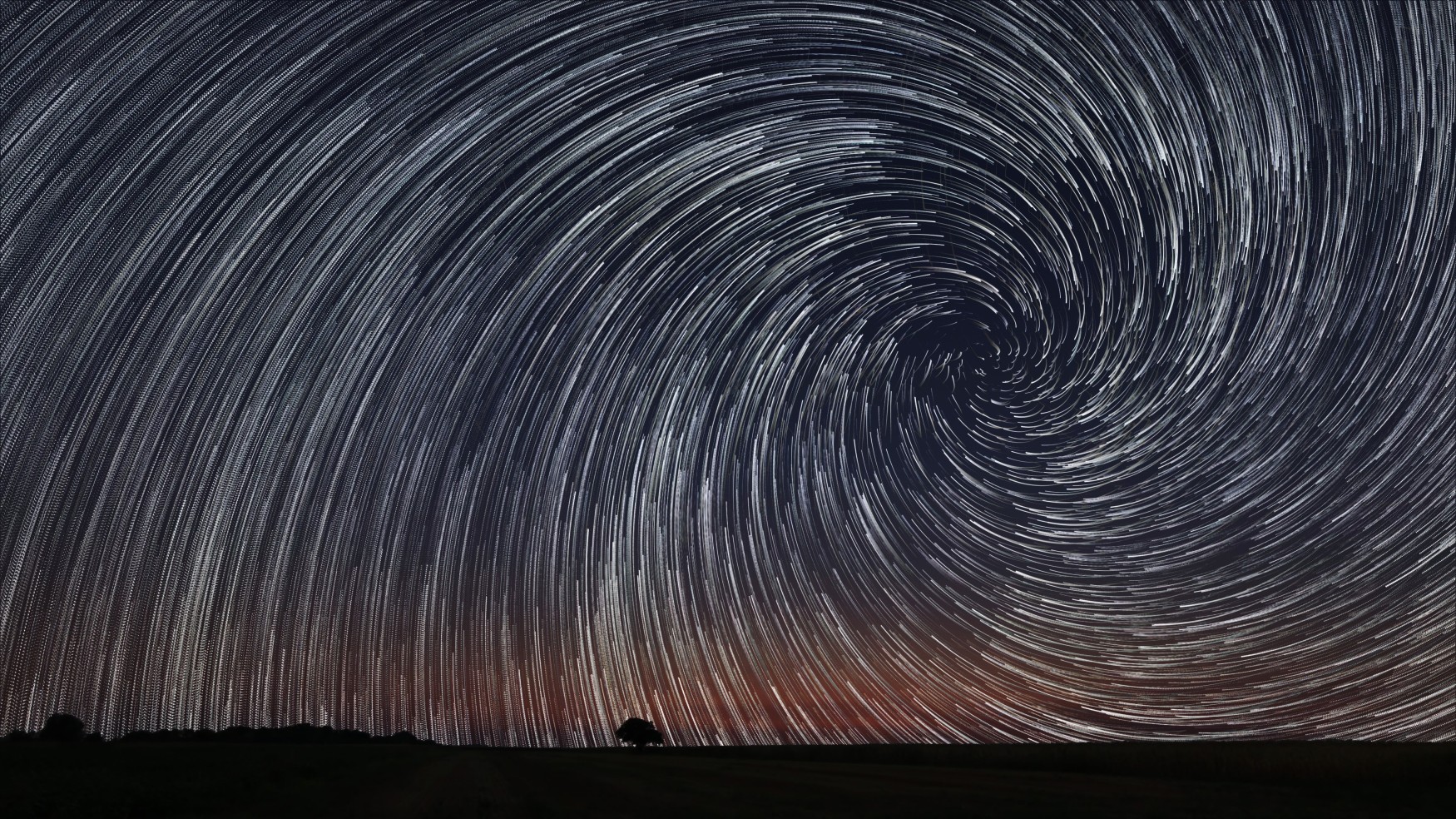Wide-angle long exposure shot of the night sky; the stars blur into white lines and converge in a spiral in the right third of the image. A thin black horizon lies at the bottom of the screen, from which the silhouettes of trees protrude.