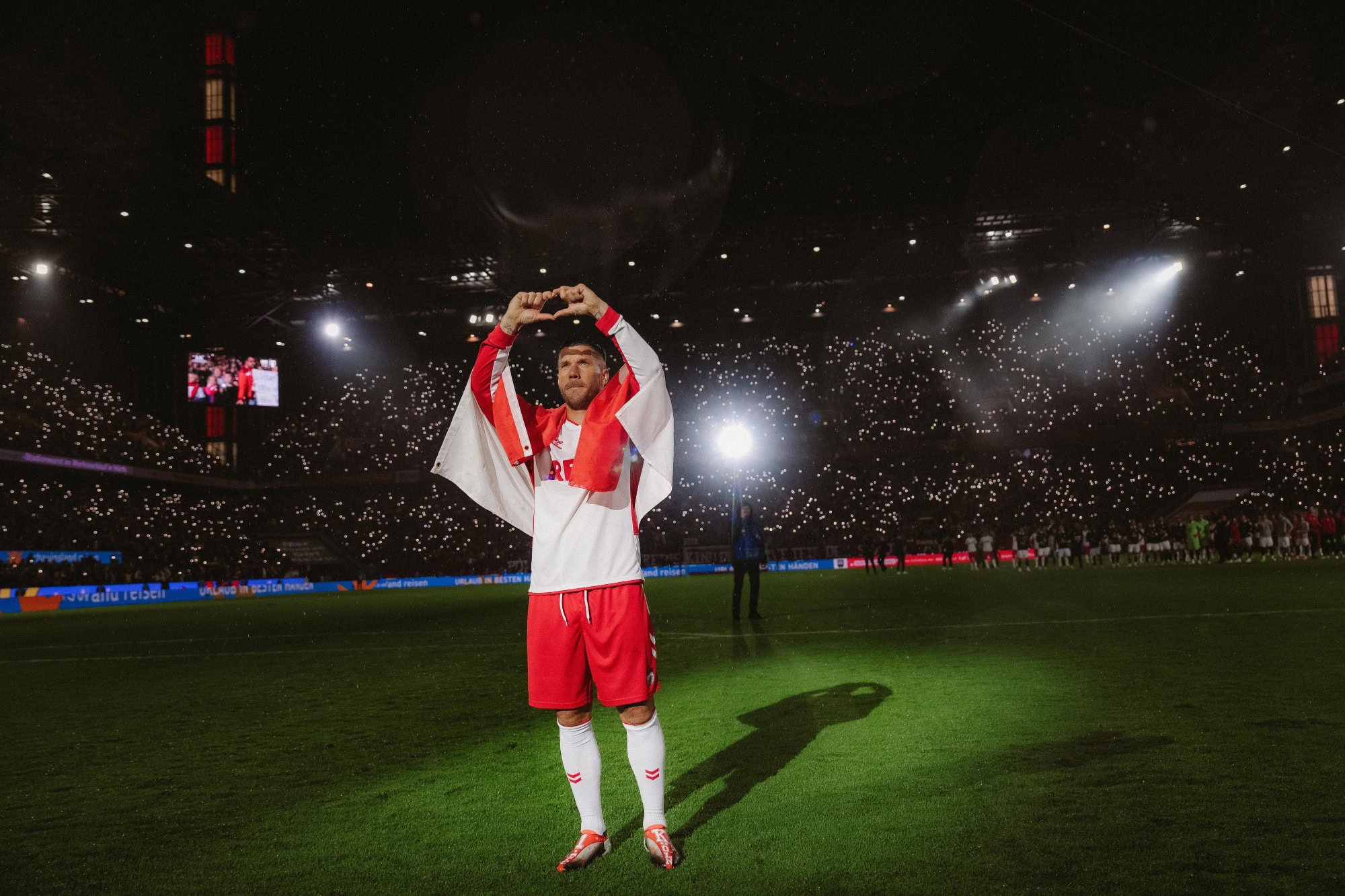 Lukas Podolski stands in the spotlight at the RheinEnergieStadion wearing the 1. FC Köln jersey and forms a heart with his hands.