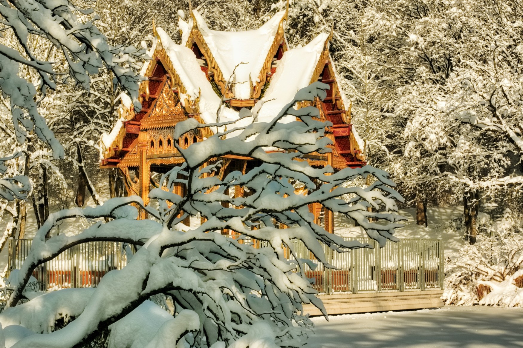 A trip to Westpark is likely to be a little quieter than the always busy English Garden. Here, too, you can go ice skating and even enjoy leisurely sledding on the park’s gently rolling hills and slopes. The photo highlight here is the Thai sala, whose golden columns stand out particularly well against the snow-white background.