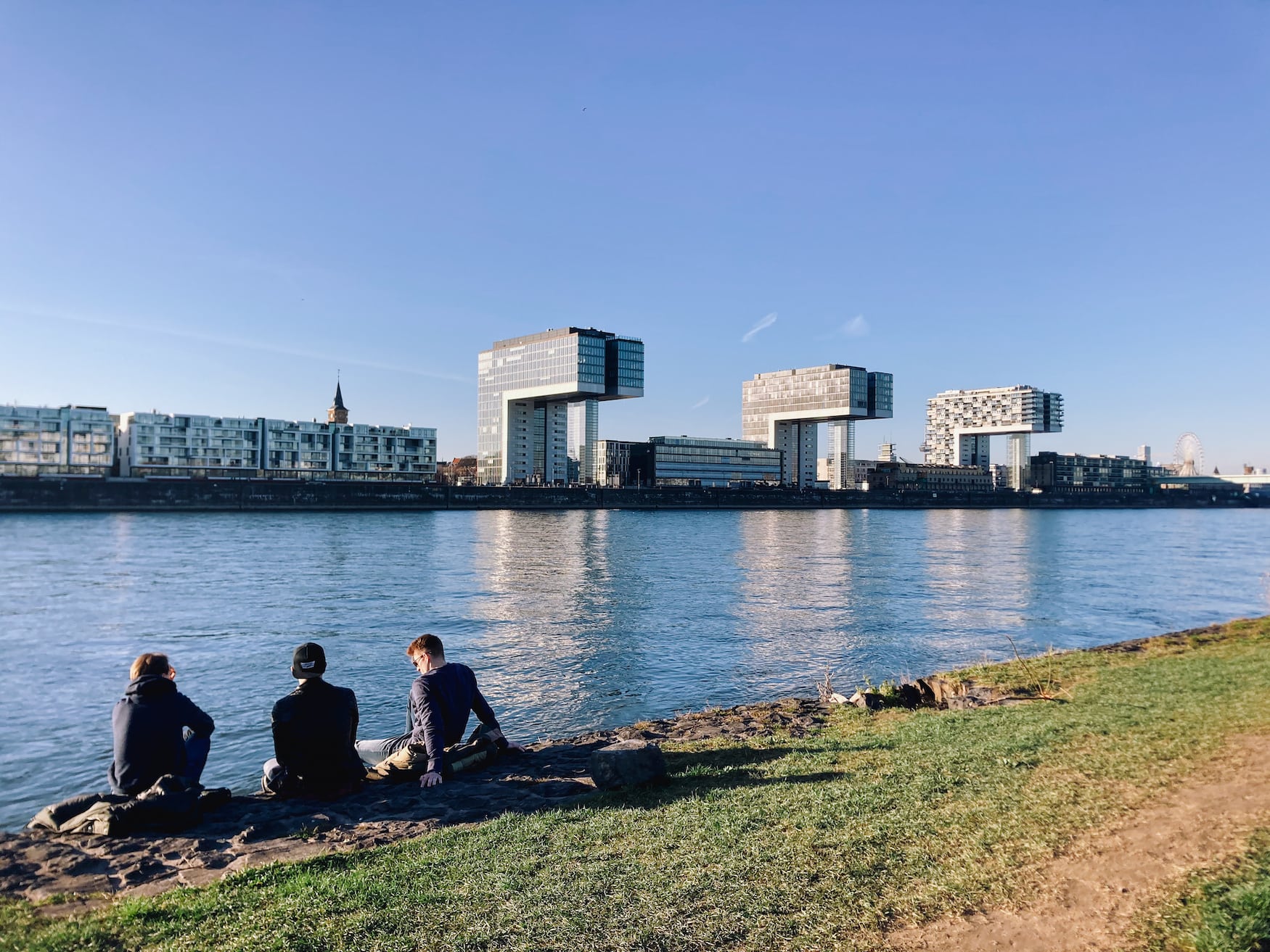 Drei Freunde sitzen an den Poller Wiesen und gucken auf den Rheinauhafen