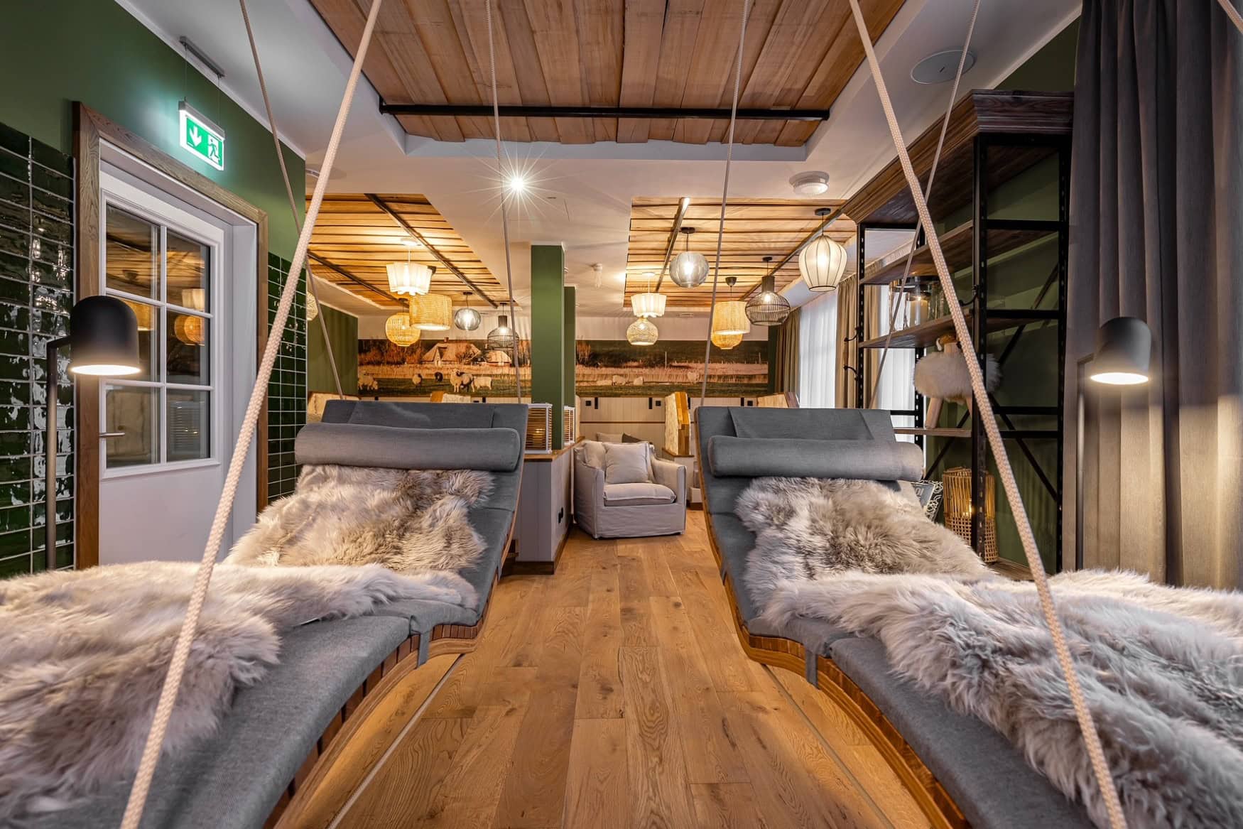 Ruheraum in einem Spa; Im Vordergrund hängen zwei hölzerne Polsterliegen an Seilen von der Decke, dahinter links eine Anrichte und rechts ein Polstersessel auf dem hölzernen Dielenboden. Das Gebälk der Decke ist teils freigelegt, teils weiß verputzt, alles hat einen rustikalen Charme.