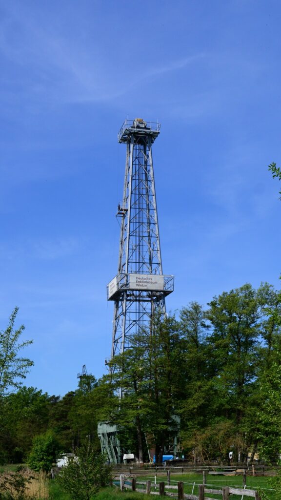 54 Meter ragt er in den Himmel und ist schon von weitem das Wahrzeichen des kleinen Ortes. Auf dem Museumsgelände steht das Industriedenkmal wie ein rostiger Leuchtturm der Erdölzeit – ein Fotomotiv mit Wow-Faktor.